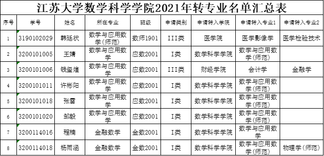 根据《色情网站 本科生转专业实施办法》(江大校【2018】10号)、《关于做好2021年本科生转专业工作的通知》(江大教〔2021〕71号)等文件精神,经个人申报、色情网站 审核,现将符合条件的同学公示如下: