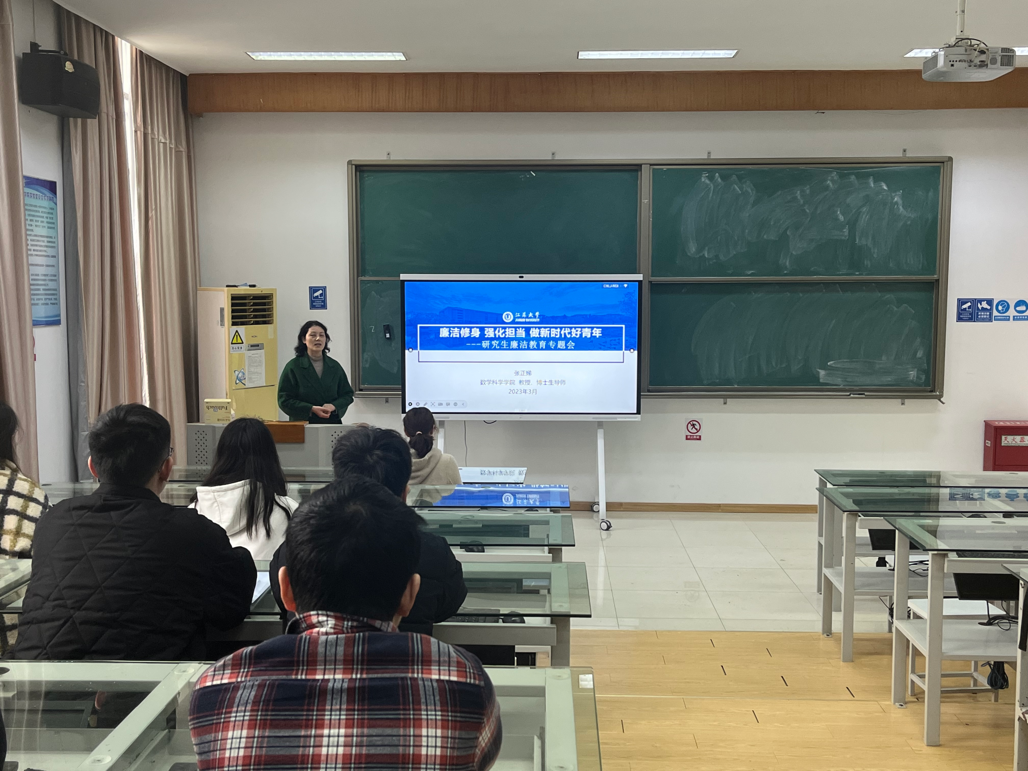 会上,张正娣根据《教育部关于在大中小学全面开展廉洁教育的意见》文件,重点介绍了廉洁教育在青年思想道德教育体系中的重要性,并强调反腐败是党心、民心所向,提醒研究生要遵守廉洁底线,规范自身行为。同时,通过列举学生科研中常见的学术不端案例,让同学们对“廉”与“洁”二字有了更深刻的认识。